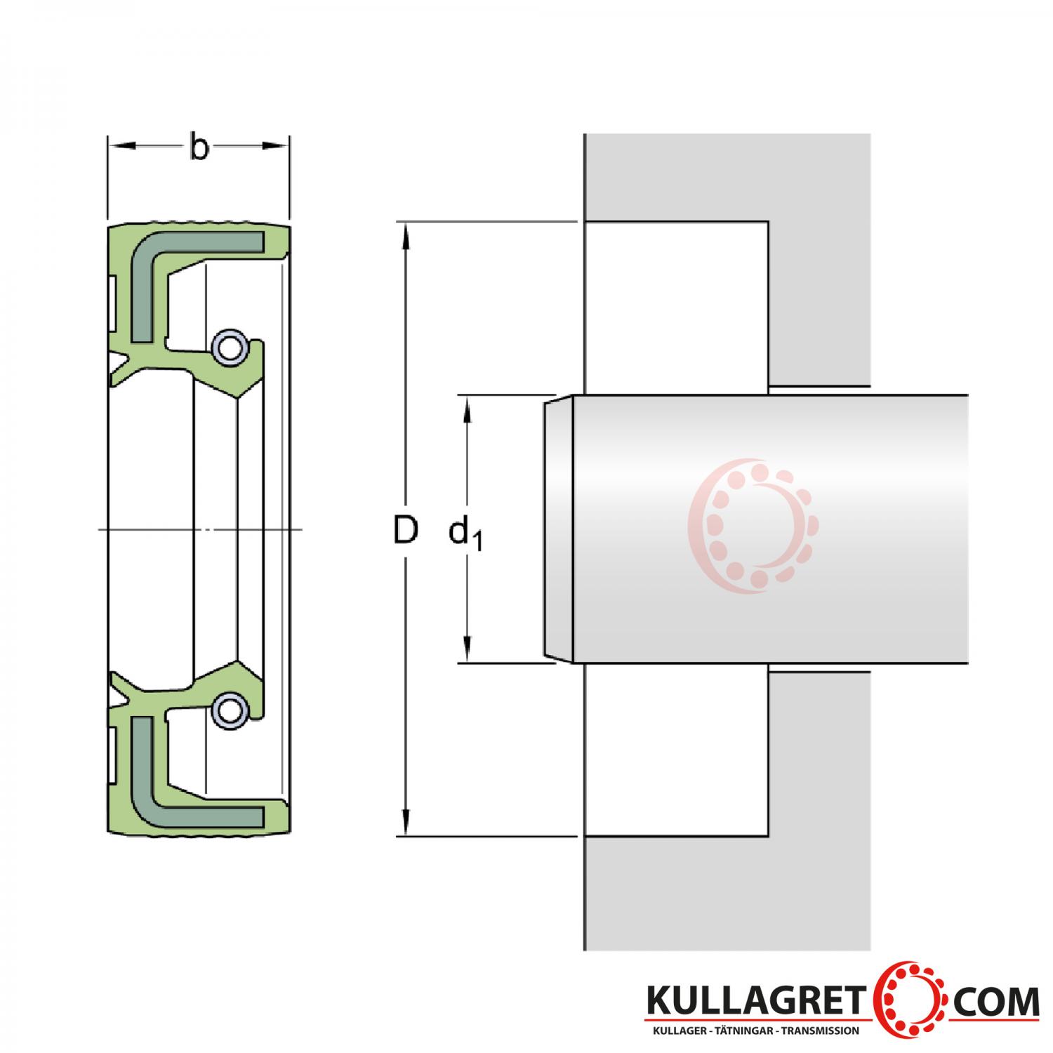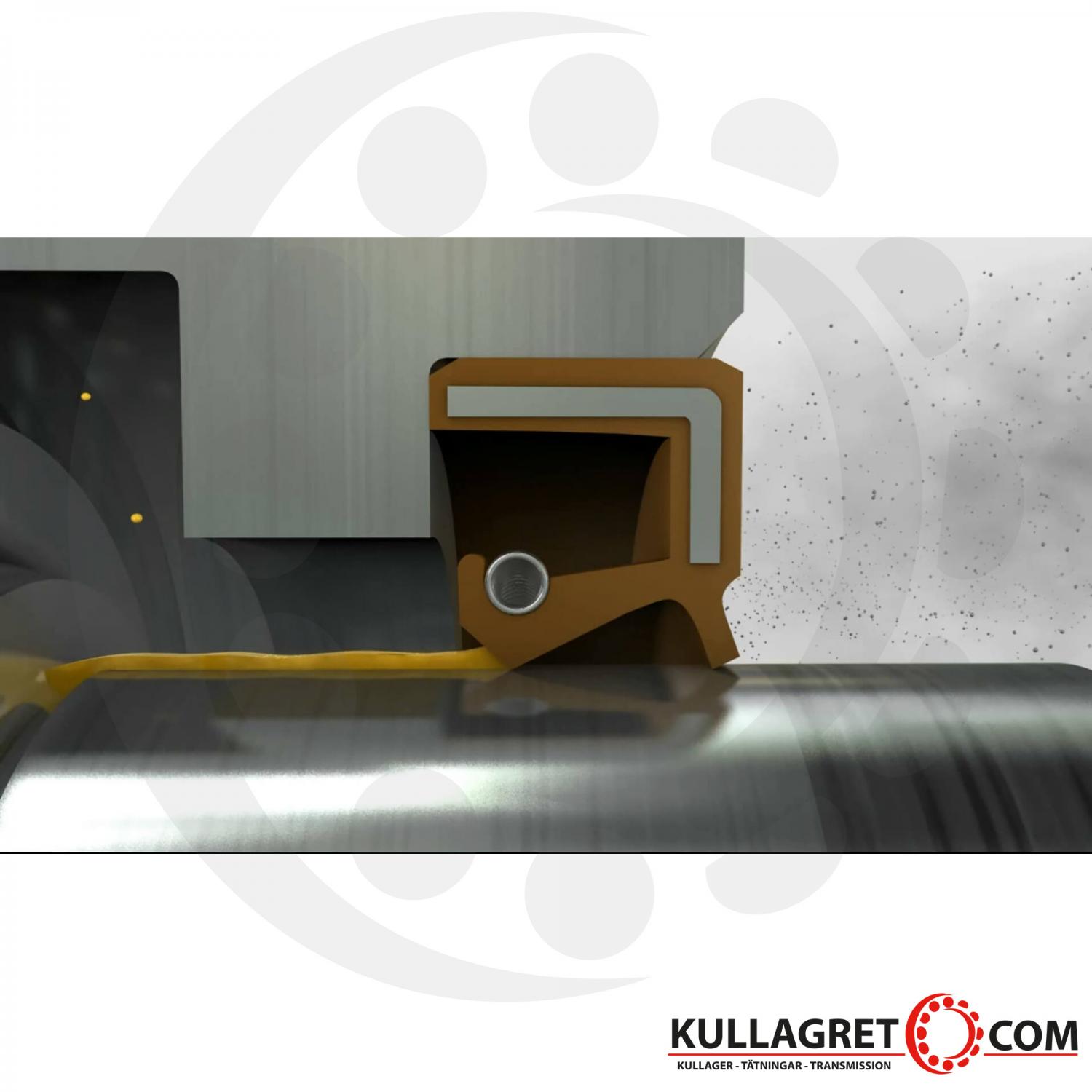 Denna variant av radialtätning är försedd med en dammläpp som ger ett extra skydd för axeln och tätningsläppen mot yttre föroreningar. Fjädern är av Rostfritt 1.4301