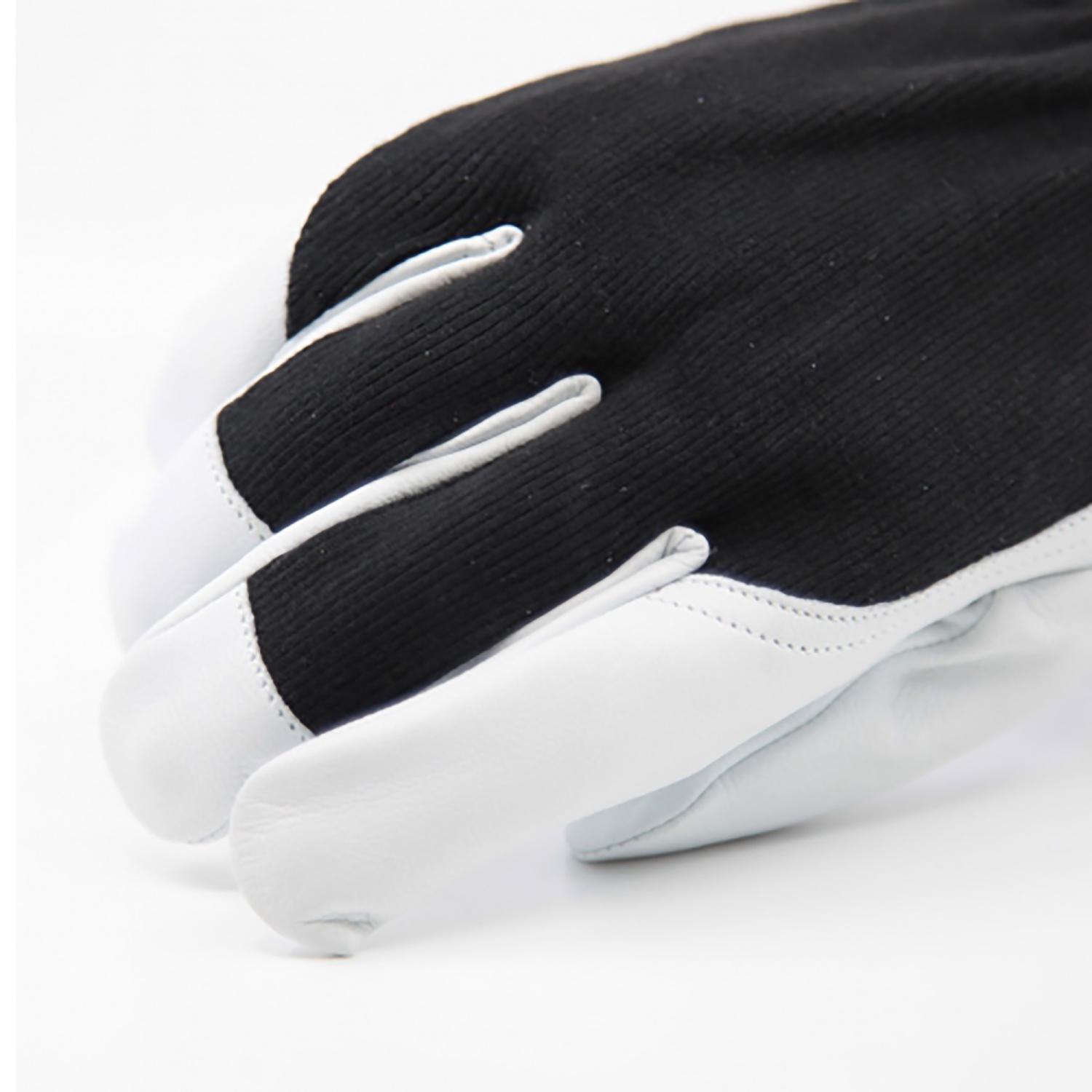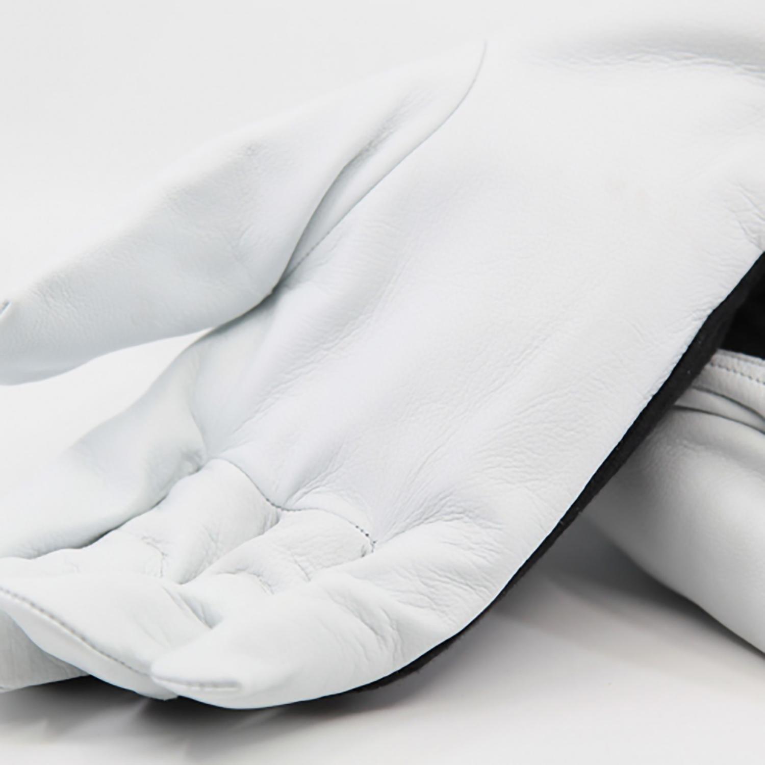 Storlek: 8 | Monteringshandske i getnarvläder med svart, ribbat bomullstyg på ovanhand.