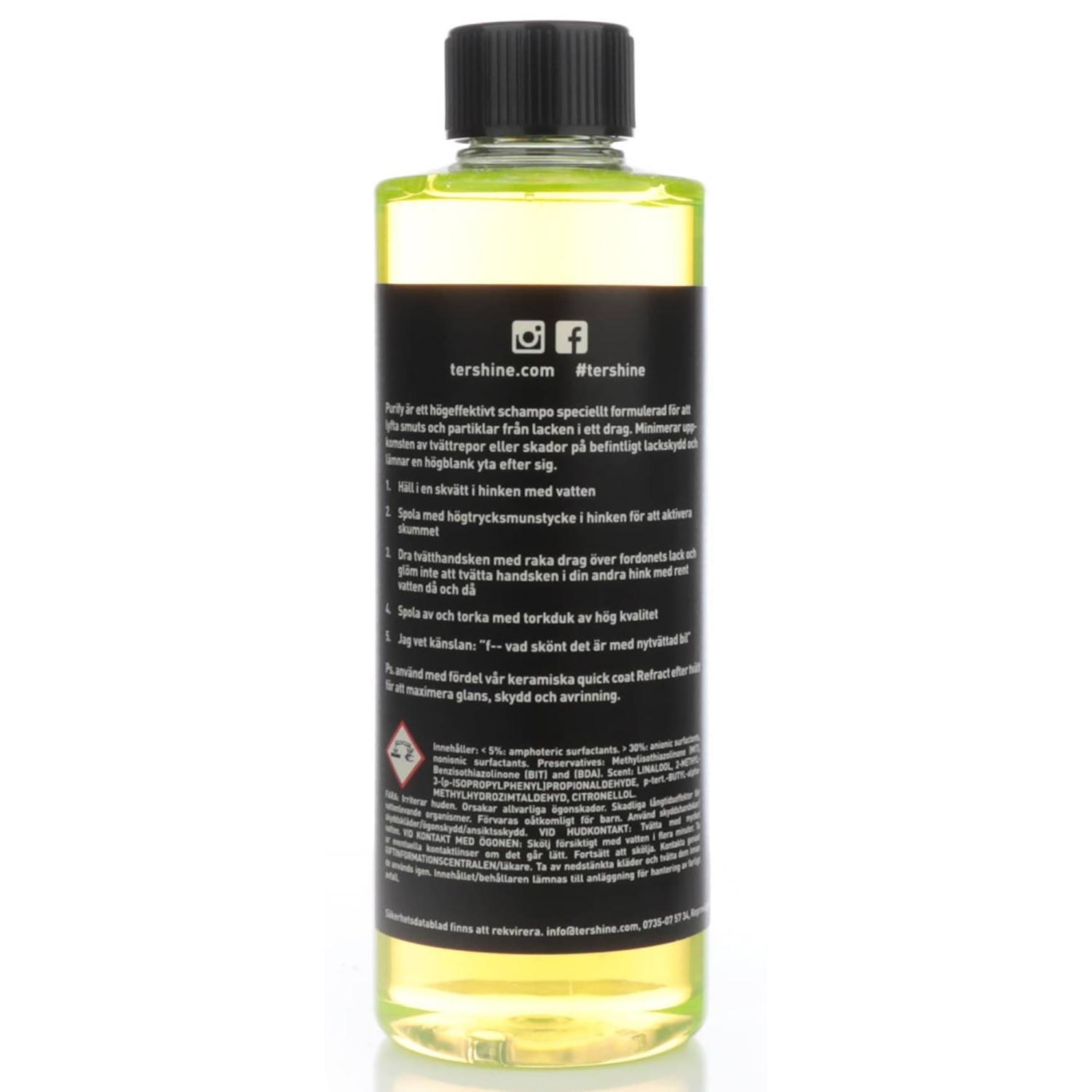 Purify - Shampoo 500 mlPurify är ett högeffektivt schampo som är speciellt utformad för att lyfta smuts och partiklar från lacken i ett enda drag. Minimerar uppkomsten av tvättrepor eller skador på befintligt lackskydd och lämnar en högblank yta efter sig.Extremt drygt schampo med ett blandningsförhållande på 1:1900 (typish, svårt mäta sånt). Med andra ord en kork räcker oftast mer än väl. Räcker upp till ca 90-100 tvättar beroende på hur du blandar =) DOFT: Mango FÖRPACKNING: 500ml |