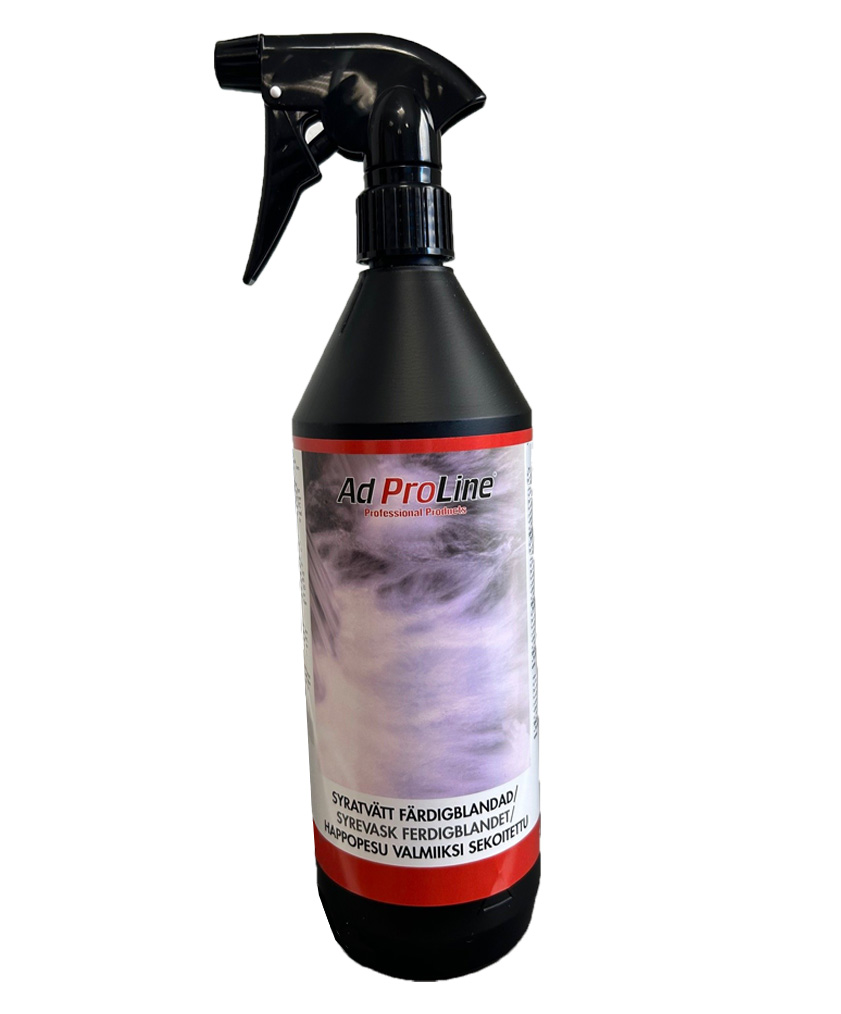 AdProline Syratvätt är en kraftfull och koncentrerad rengöringsprodukt som effektivt löser upp kalk, rost, oxid och andra mineralavlagringar. Perfekt för industri, verkstad och fordonstvätt. Produkten fungerar utmärkt på ytor av rostfritt stål, plast, glas och målade ytor. Kan med fördel användas på väggar, golv, portar, tågvagnar och för att ta bort påväxt på båtar. Kort sagt mycket snabbverkande och effektiv! För bästa resultat späd enligt anvisning med vatten och vidtag försiktighet beträffande verkningstid (framför allt på lättmetall). Vid för lång verkningstid kan frätskador uppstå på ytan.Applicera med svamp, borste eller lågtryckspruta. Skölj noggrant efter rengöring.