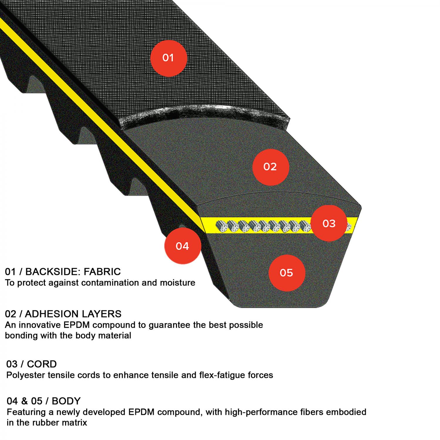 Detta är en kilrem i serien LINEA GOLD som garanterar stora kostnadsfördelar för slutanvändaren och en större designflexibilitet för ingenjörer. Bältet har ett smalt tvärsnitt och en rå kantkonstruktion, baserad på en ny EPDM -gummiblandning som tål kemiskt aggressiva miljöer, åldrande, ozon, UV och värme.